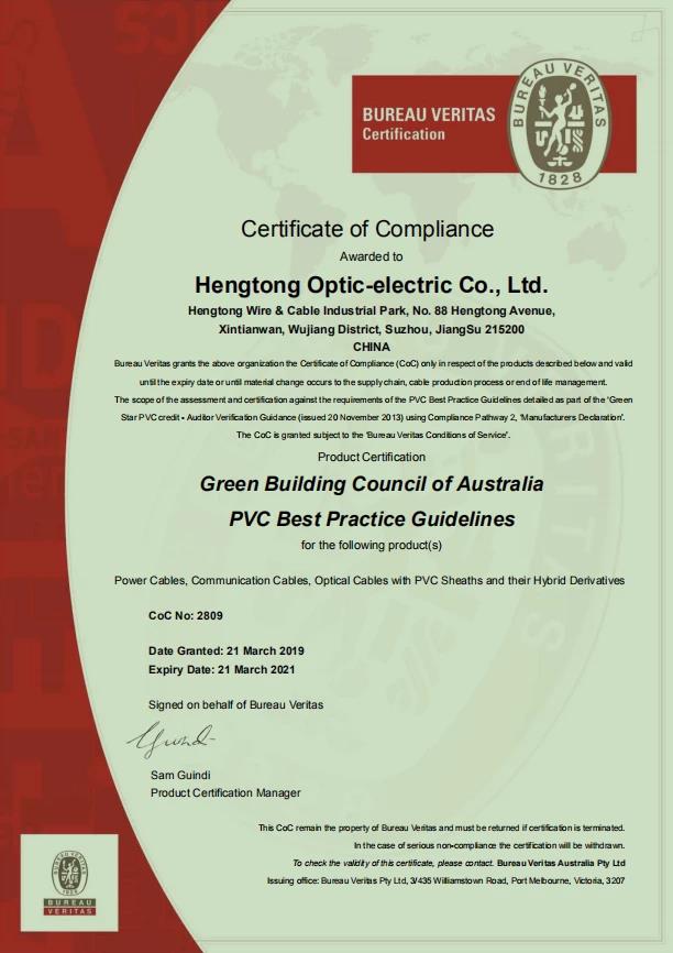 The certification covers power cables, communications cables, optical cables and their hybrid products containing PVC materials. In order to meet the mandatory requirements of high-end green environment protection in Australia, Hengtong’s technical and purchasing department established a comprehensive guarantee plan to strictly select raw materials suppliers and comprehensively evaluate its relevant supply chain companies, as to ensure the acquisition of the certification in the planning time.